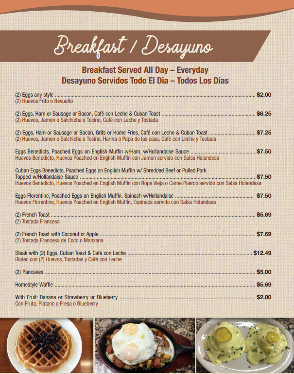 “ Great Cuban food. Had dinner here one night and had to come back for breakfast. We would definitely come back. Hubby was a little disappointed in the grits but I hate grits so no problem for me. ”